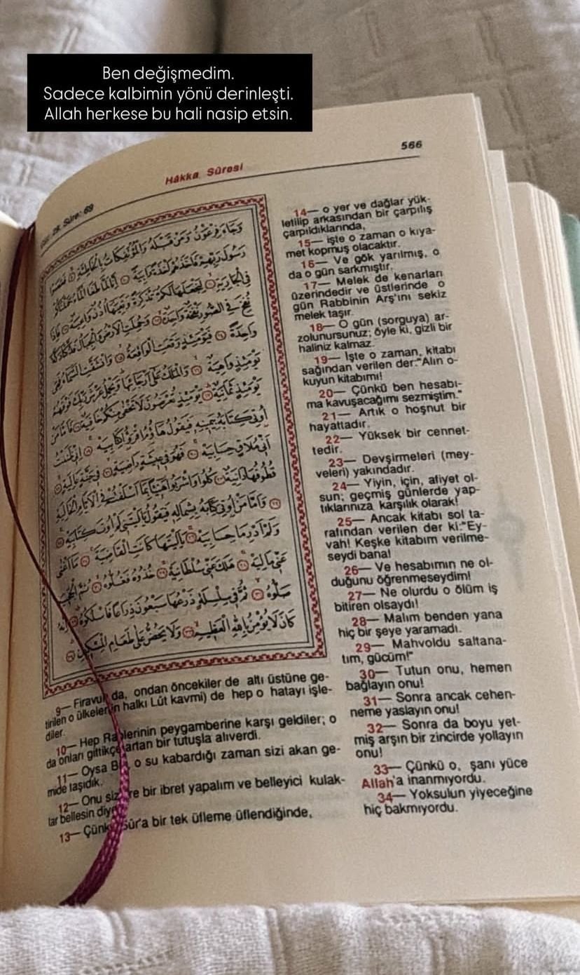 Subaşı, Instagram hikayesinde Kur’an-ı Kerim’den bir sayfa paylaşarak fotoğrafın üzerine şu notu düştü: